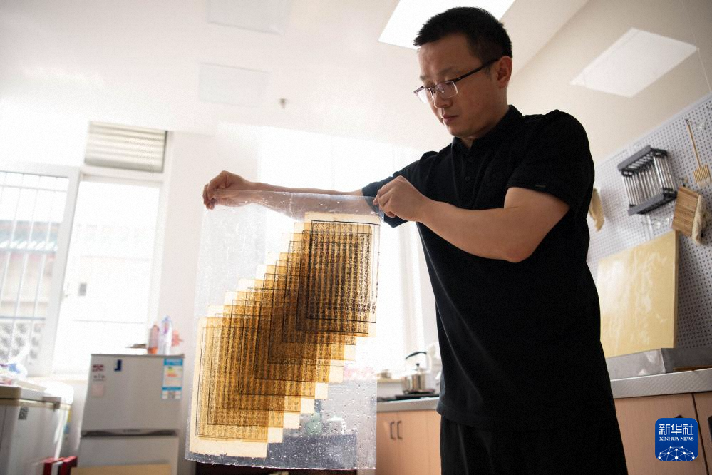6月24日,在安徽省图书馆内,古籍修复师臧春华在揭开清洗后的书叶。新华社记者 张端 摄