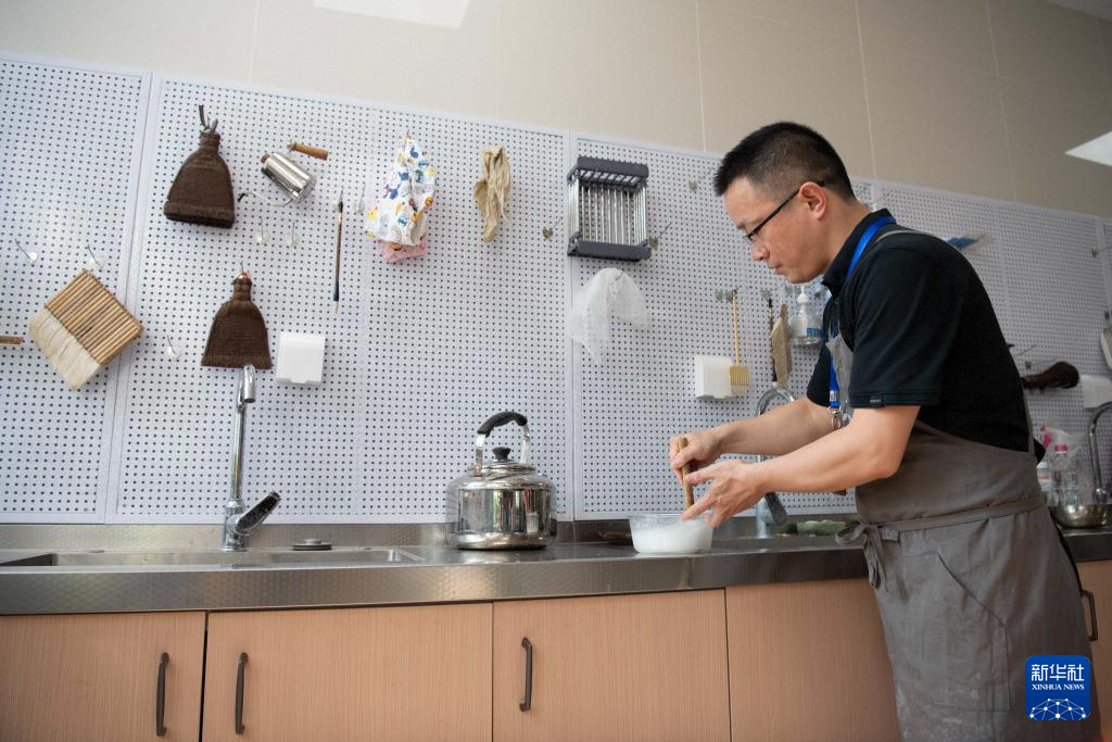 8月5日,在安徽省图书馆内,古籍修复师臧春华在调制古籍修复所需使用的浆糊。新华社记者 张端 摄
