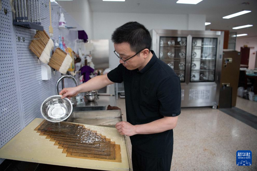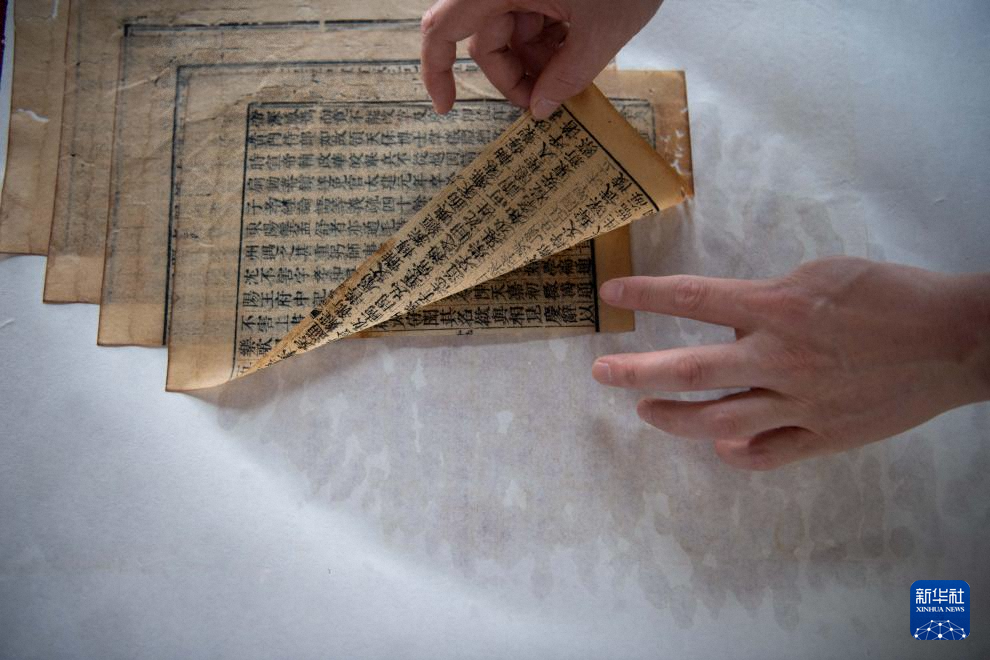 8月5日,在安徽省图书馆内,古籍修复师臧春华将经过清洗的书叶晾干。新华社记者 张端 摄