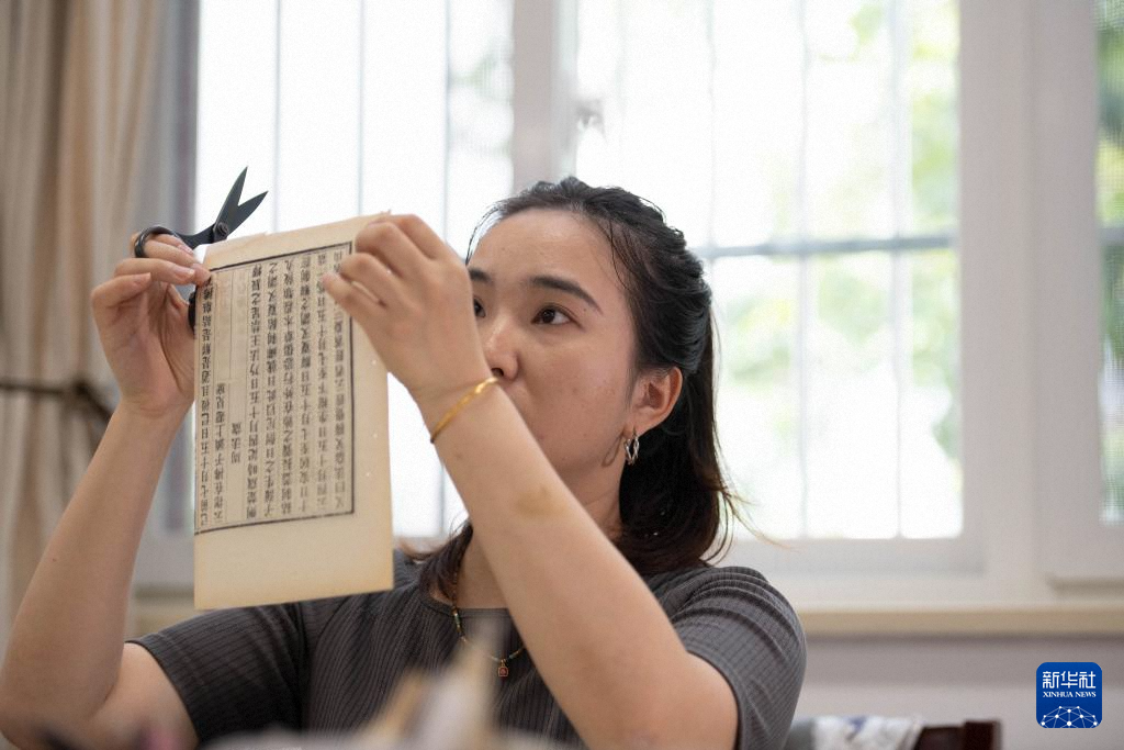 6月4日,在安徽省图书馆内,古籍修复师耿宁在修剪书叶。新华社记者 张端 摄