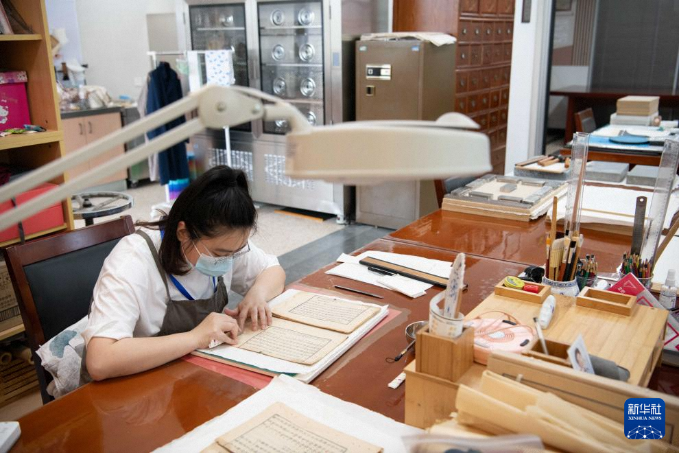 6月17日,在安徽省图书馆内,古籍修复师耿宁在修补书叶。新华社记者 张端 摄