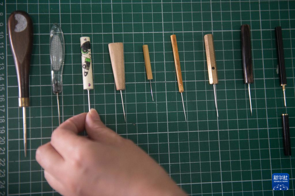6月4日,在安徽省图书馆内,古籍修复师耿宁在介绍古籍修复所需使用的工具。新华社记者 张端 摄