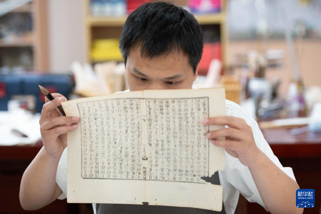 6月24日,在安徽省图书馆内,古籍修复师金鑫查看书叶破损情况。新华社记者 张端 摄