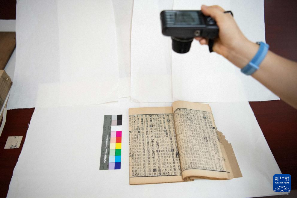 8月5日,在安徽省图书馆内,古籍修复师周亚寒在修复古籍前进行拍照留存。新华社记者 张端 摄