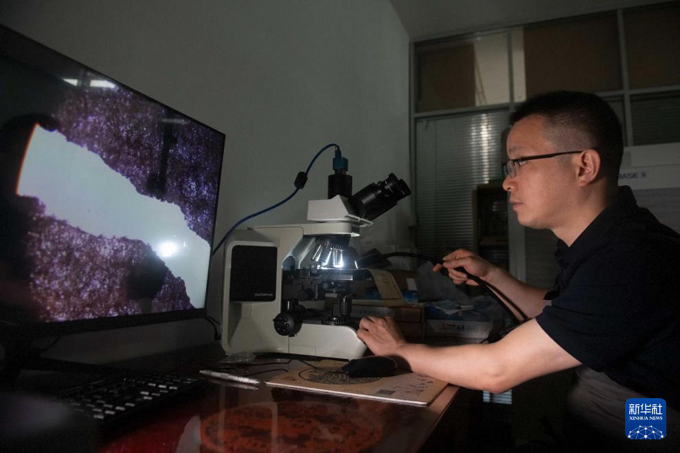 6月4日,在安徽省图书馆内,古籍修复师臧春华在使用专业仪器查看纸张纤维。新华社记者 张端 摄