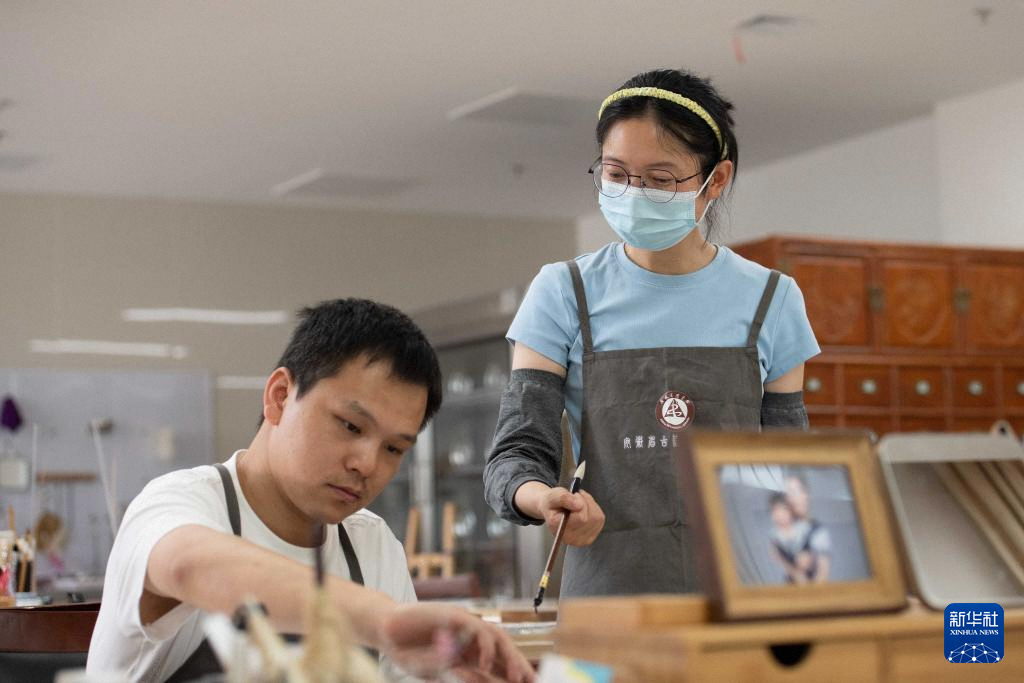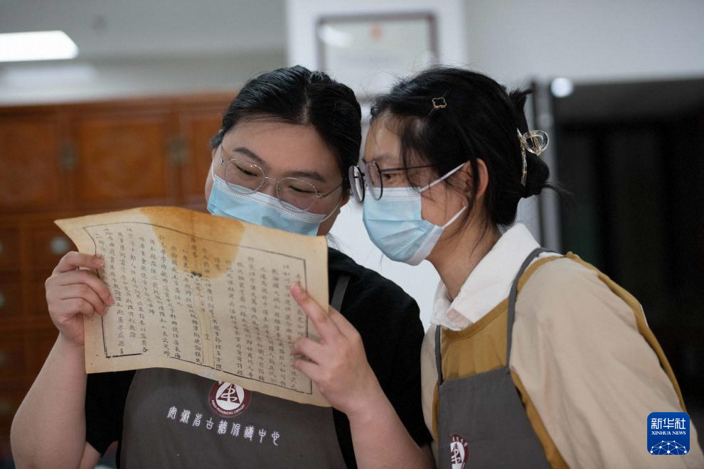 6月17日,在安徽省图书馆内,古籍修复师张文文(右)与同事金鑫在古籍修复过程中交流。新华社记者 张端 摄