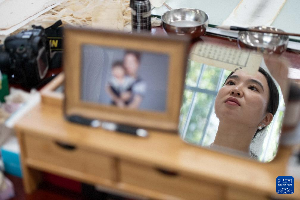 6月17日,在安徽省图书馆内,古籍修复师耿宁查看修补中的书叶。新华社记者 张端 摄