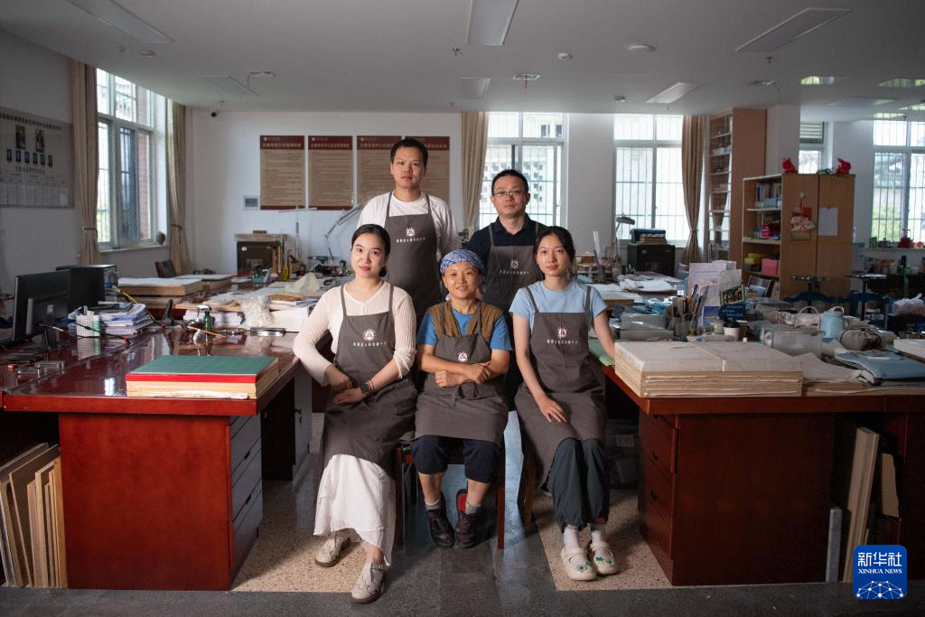 6月17日,安徽省图书馆的古籍修复师们合影留念(前排从左至右依次为:耿宁、周亚寒、张文文,后排从左至右依次为:金鑫、臧春华)。新华社记者 张端 摄