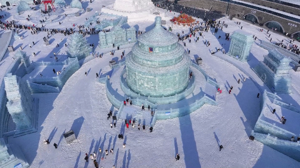 在冰雕雪塑的世界里,一座座以中式建筑为蓝本的冰建筑巍峨耸立,哈尔滨不断向世界展示多姿多彩的国风元素。匠人们凭借精湛技艺,以冰雪为笔,缓缓铺陈开一幅幅中国历史文化的壮丽画卷。