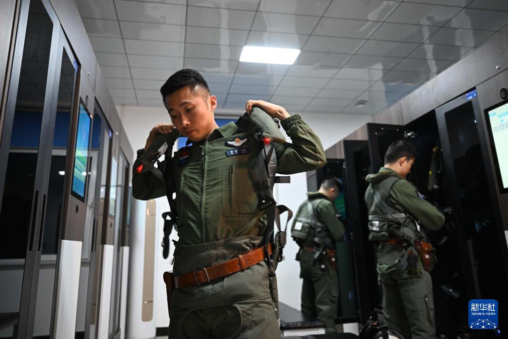空军航空兵某团团长董珺(左)穿戴装具,准备进行夜航训练(2024年7月21日摄)。新华社发(余红春摄)
