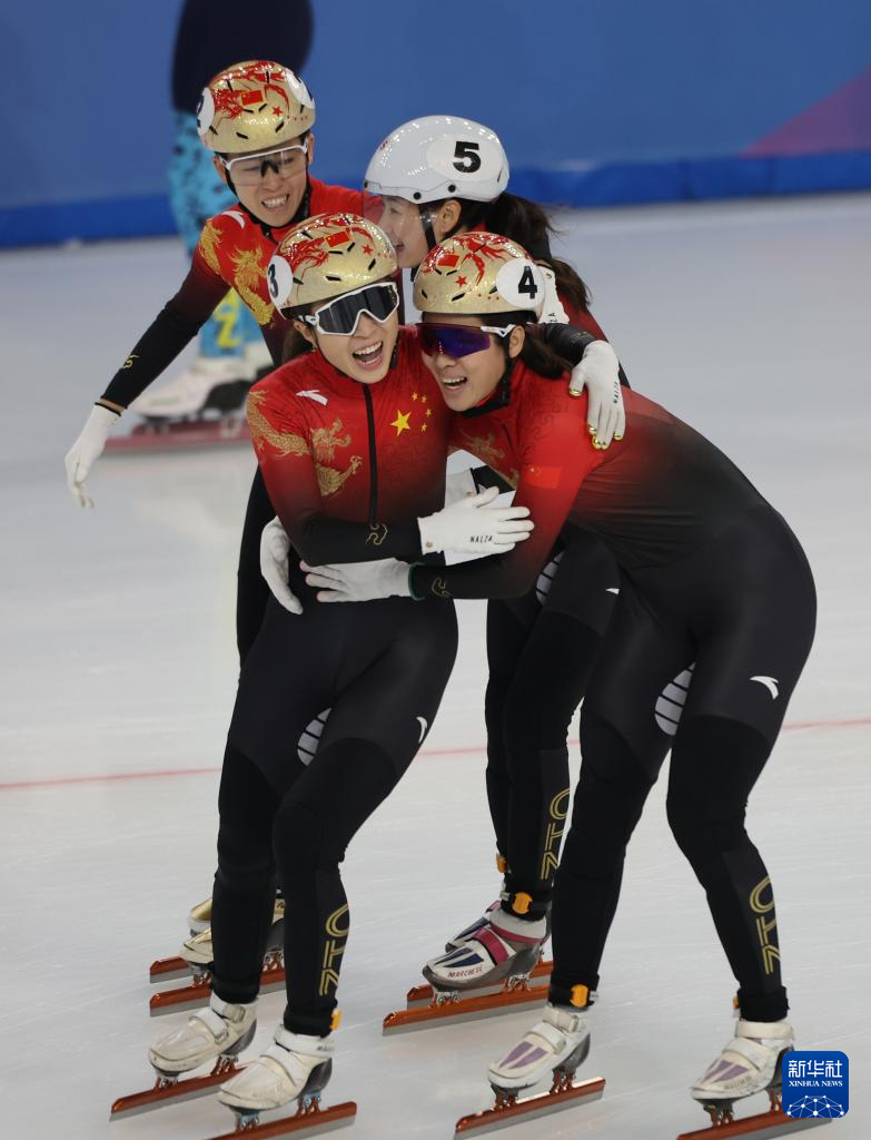 2月9日,中国队选手张楚桐、公俐、王欣然、范可新(从右到左)庆祝夺冠。