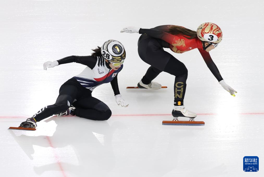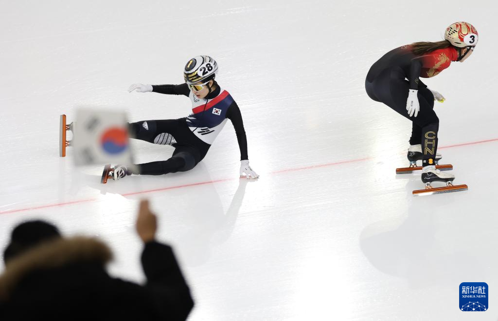 2月9日,中国队选手公俐(右)在比赛中冲刺,韩国队选手金吉莉在比赛中摔倒。