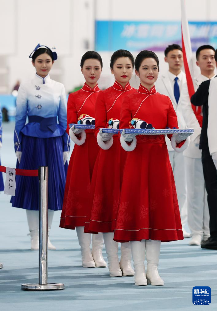 2月9日,护旗手在颁奖仪式上手持国旗进入场内。