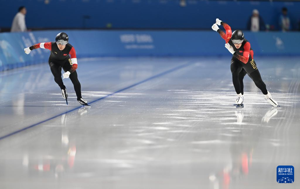 2月10日,中国队选手高亭宇(左)与队友廉子文在比赛中。
