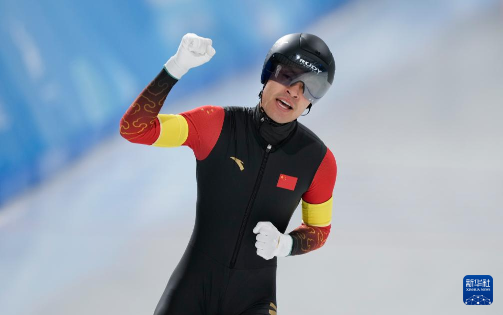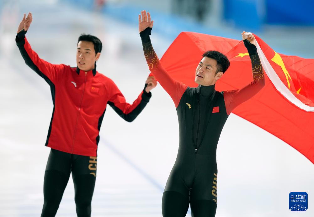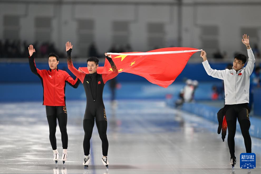 2月10日,中国队选手高亭宇、宁忠岩、廉子文(从右到左)在比赛后庆祝。