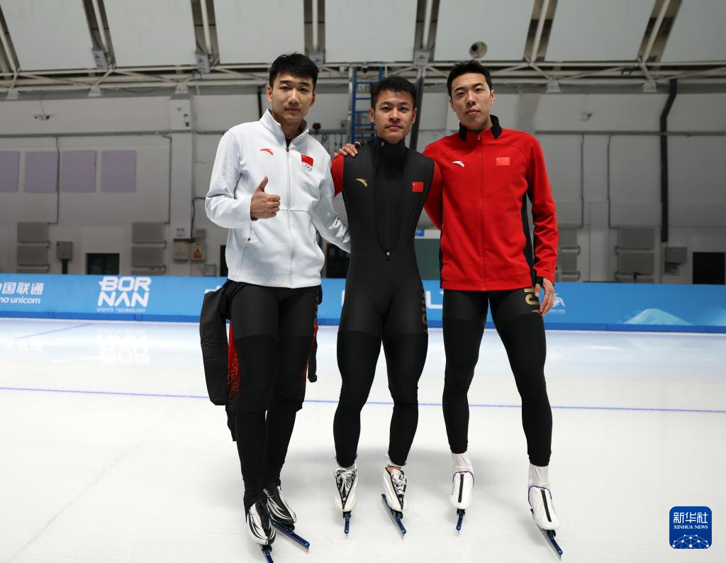 2月10日,中国队选手高亭宇、宁忠岩、廉子文(从左到右)在比赛后合影。
