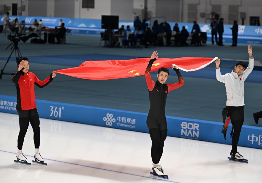 黑龙江省冰上训练中心速滑馆里,《义勇军进行曲》三度奏响。当日速度滑冰全部3枚金牌均被中国队收入囊中。高亭宇先以0.02秒的微弱优势力压日本选手森重航,夺得男子500米冠军;又与队友廉子文、宁忠岩合作,夺得男子短距离团体追逐金牌。女队则又一次让三面五星红旗同时升起,杨滨瑜、韩梅、太智恩分获女子3000米前三名。本届亚冬会有三金入账的高亭宇坦言不知道这会不会是自己最后一届亚冬会,“(这次)我的关键词是努力,相信大家一起努力,中国速度滑冰会越来越好”。