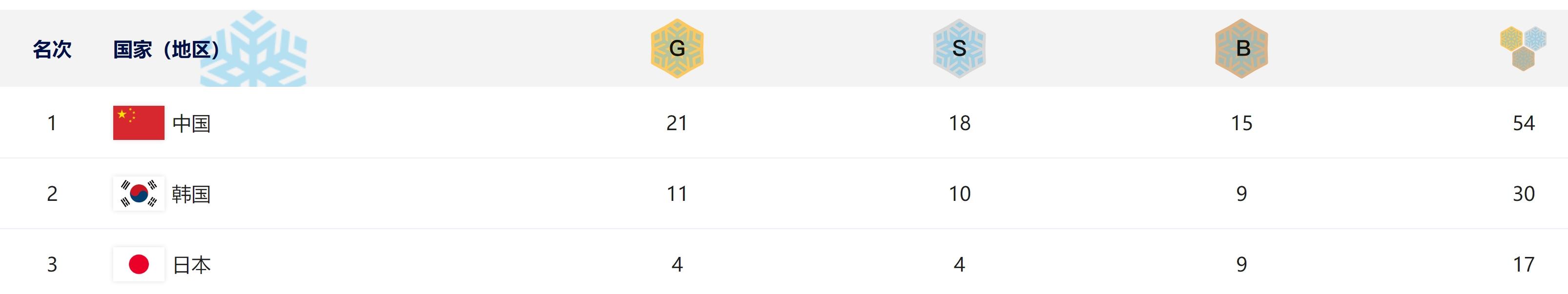 单日再夺6金,中国代表团在本届亚冬会已夺得21金18银15铜,21金也创造了中国代表团参加单届亚冬会历史最佳成绩(此前为2007年长春亚冬会的19金)。韩国队目前以11金10银9铜排名奖牌榜第二,日本队以4金4银9铜排名第三。