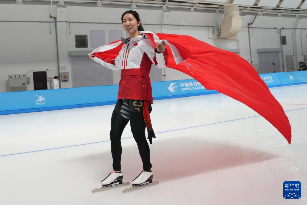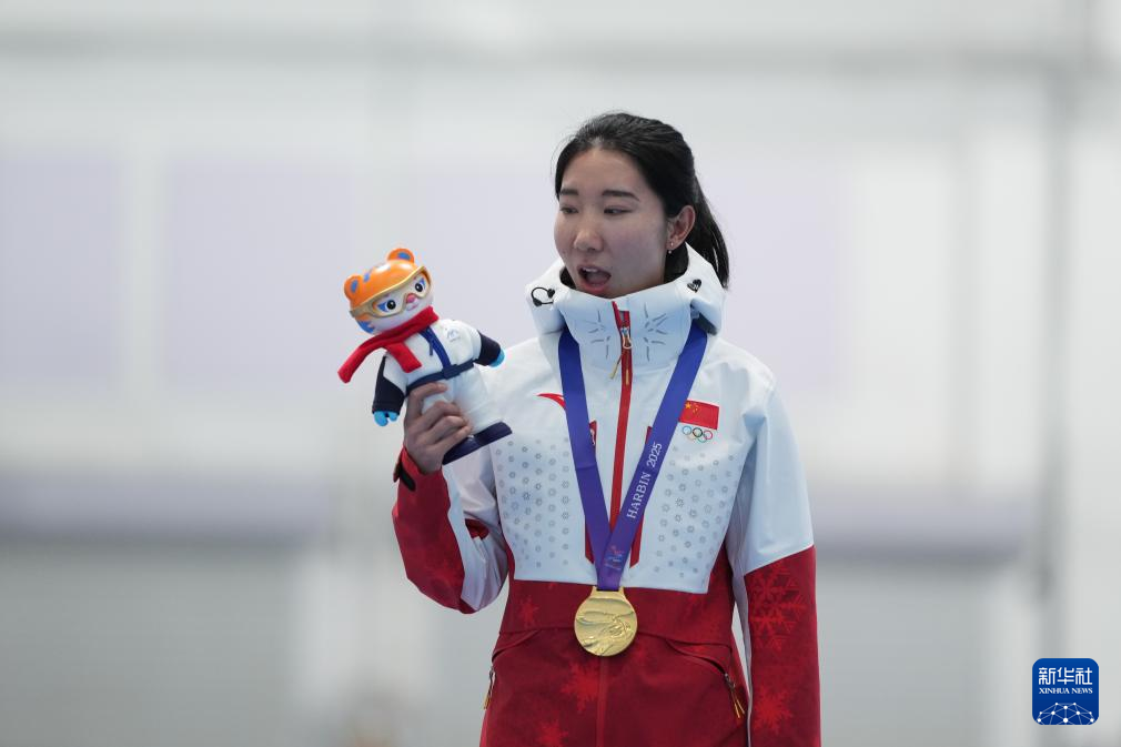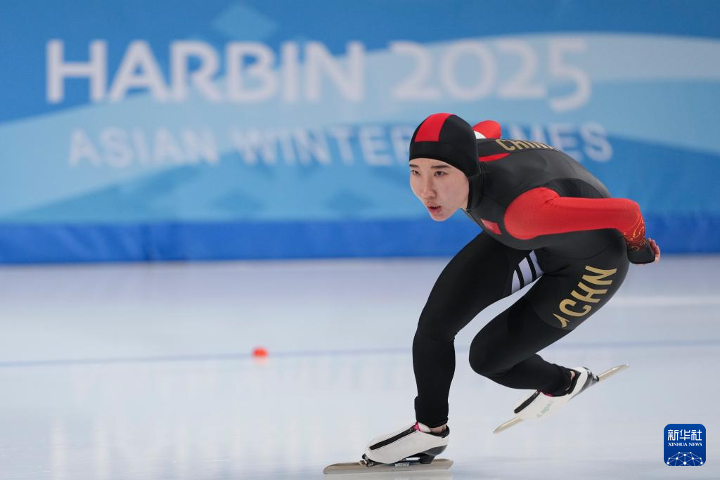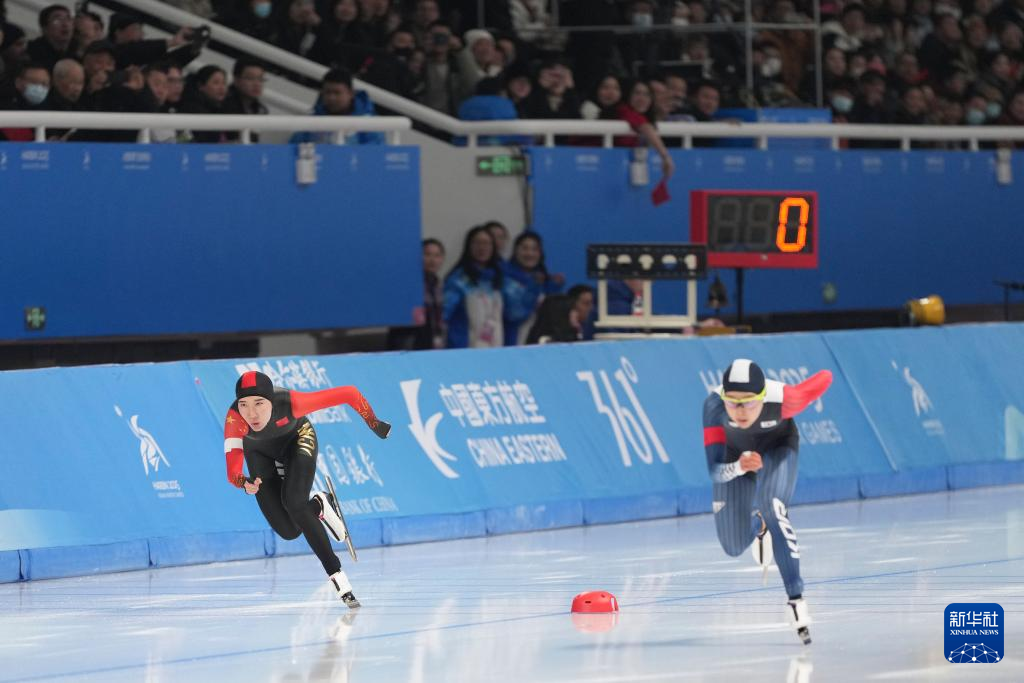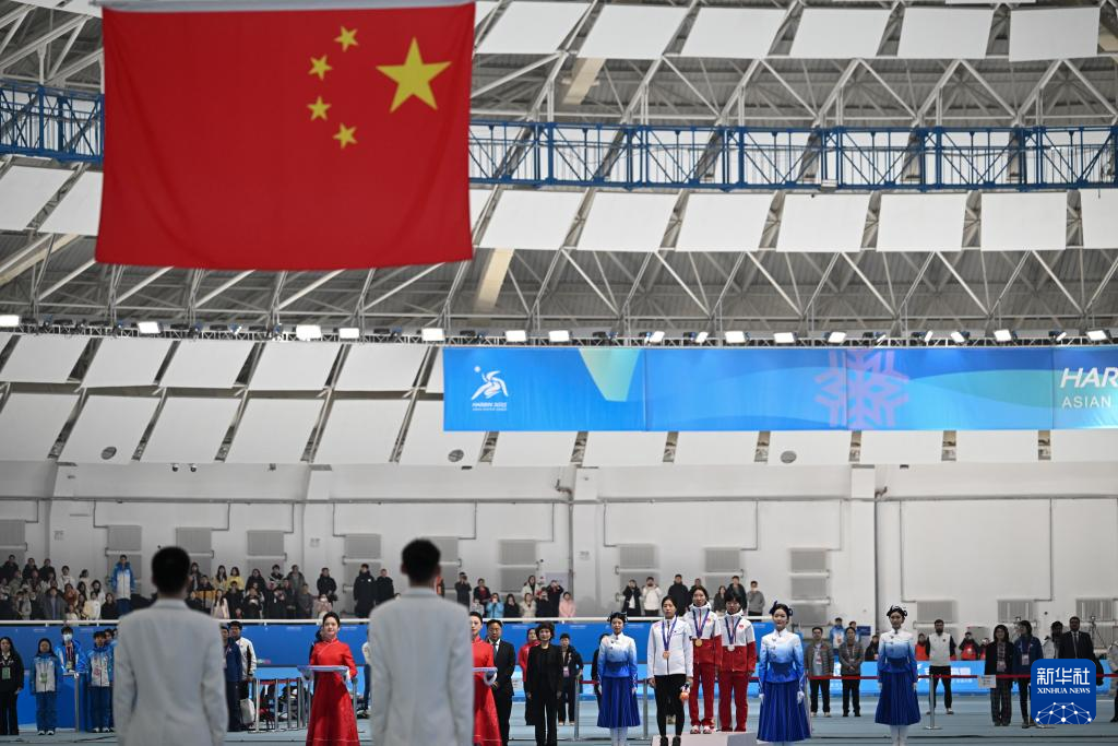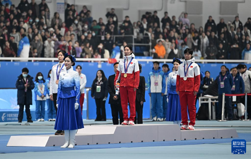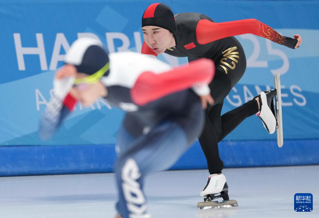 当日,第九届亚冬会速度滑冰女子1000米决赛在哈尔滨举行。中国选手韩梅、殷琦分别获得冠军、亚军。
