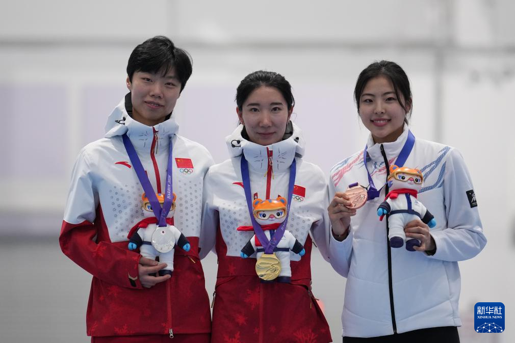 2月11日,冠军中国选手韩梅、亚军中国选手殷琦和季军韩国选手李娜贤在颁奖仪式上。