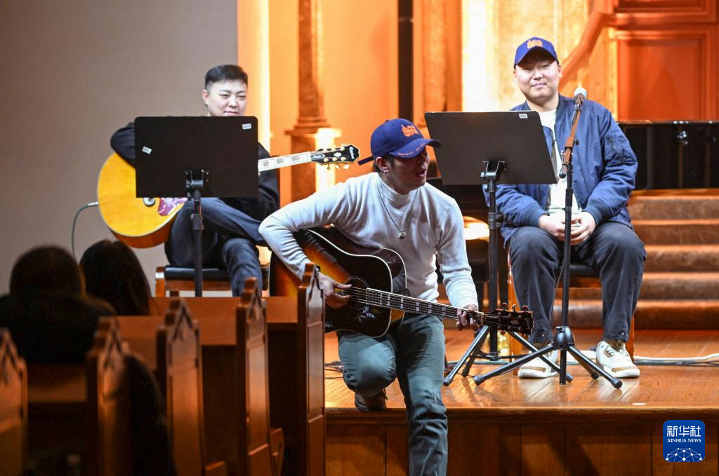 1月29日,人们在哈尔滨老会堂音乐厅里欣赏民谣歌会。