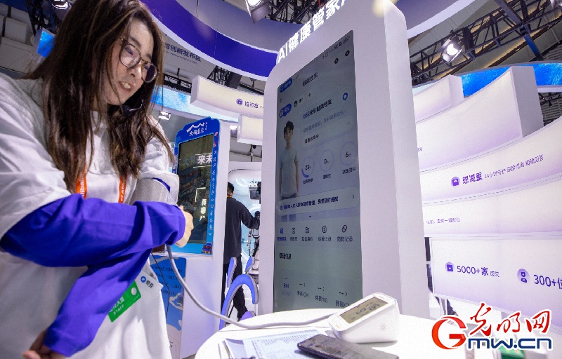 2025年11月6日,蚂蚁集团展台,参观者在体验AI健康管家AQ。