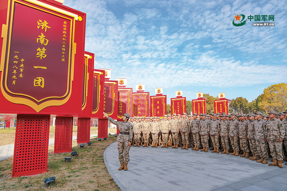 陆军某旅在战旗广场开展教育活动,讲解员为官兵讲述战旗背后的英雄故事。 黄振宇摄