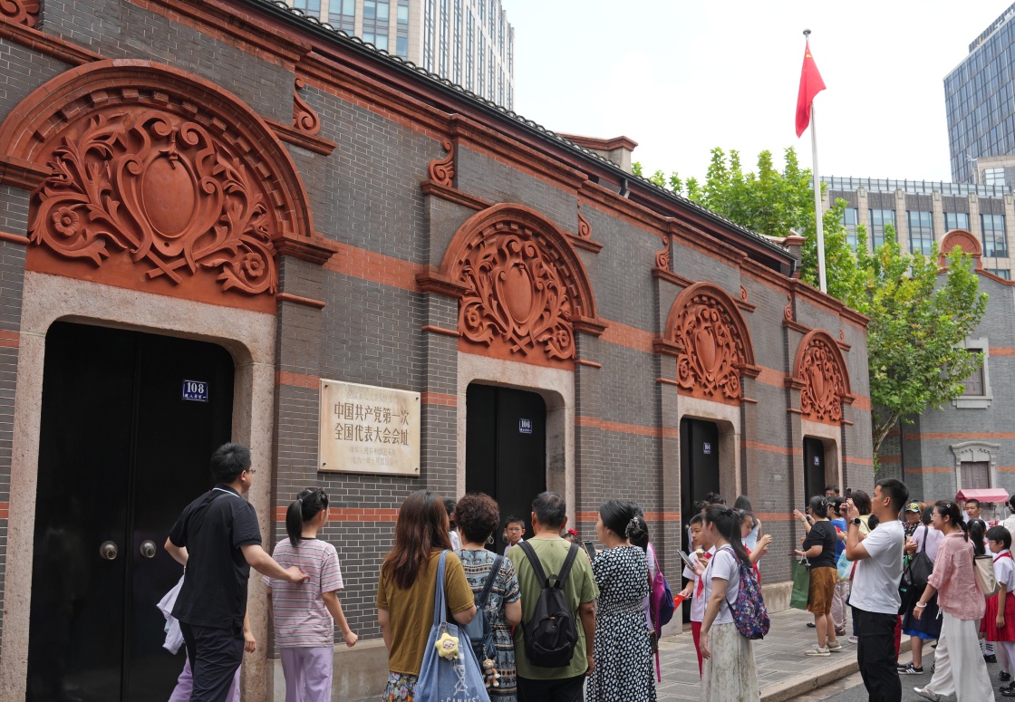 10月1日,游客在上海中共一大会址前参观拍照。