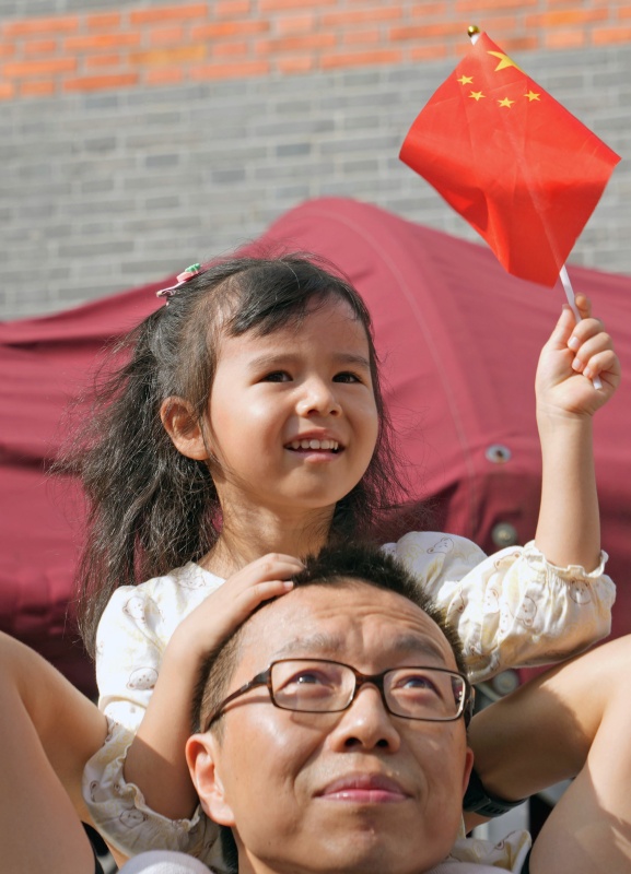 10月1日,在上海中共一大纪念馆,一名小女孩坐在爸爸的肩膀上观看升旗。