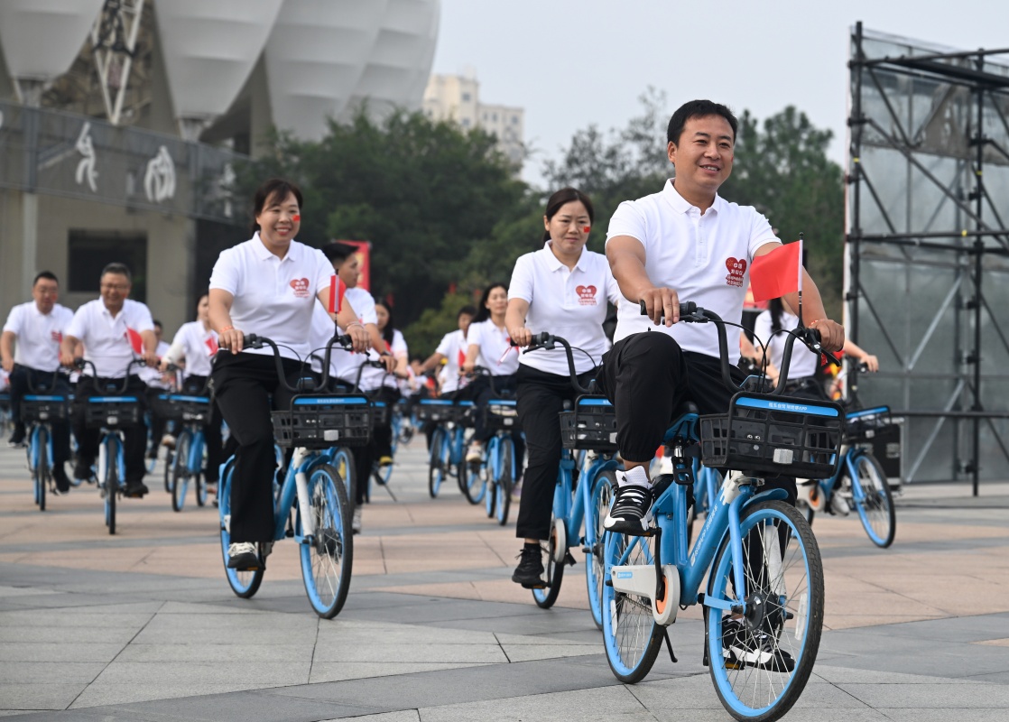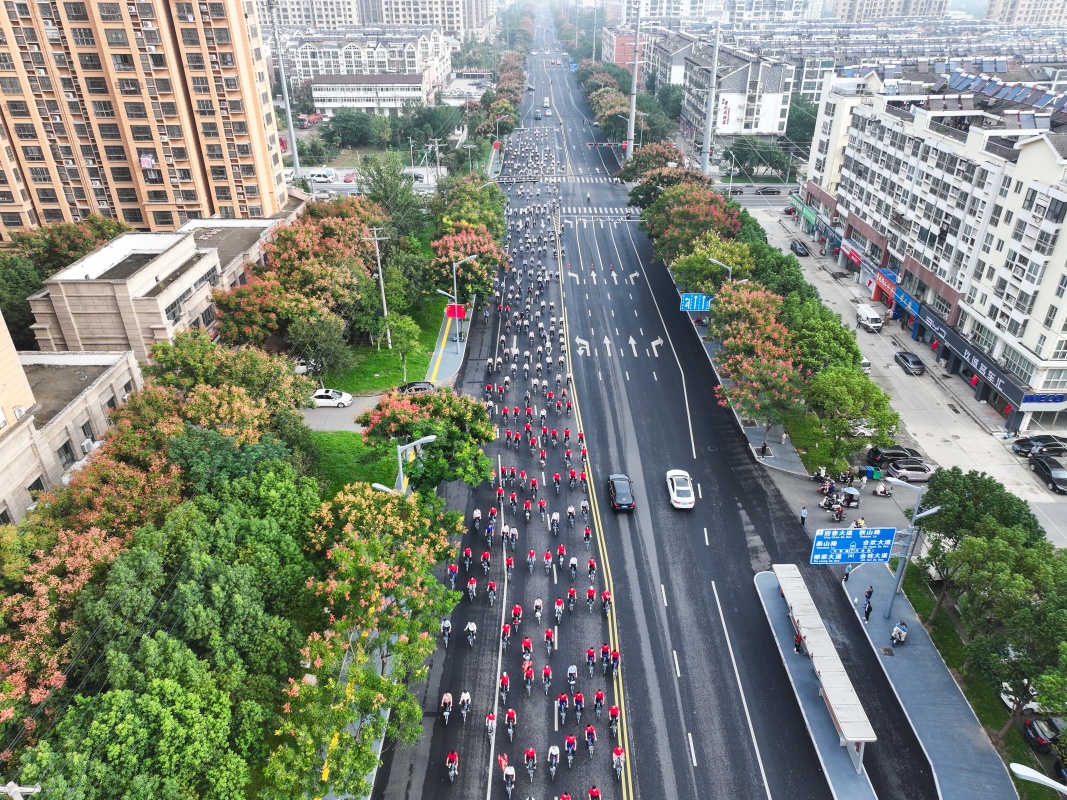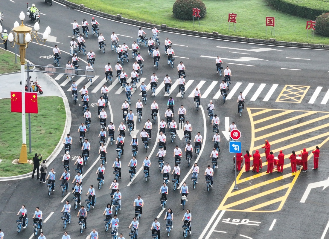 10月1日,江苏省淮安市盱眙县举行“共贺祖国华诞”绿色骑行活动,参与者骑车出发。