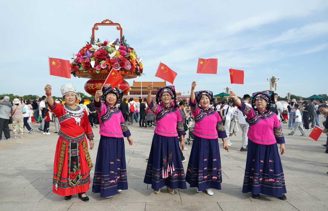 10月1日,来自贵州的布依族游客在北京天安门广场游览拍照。
