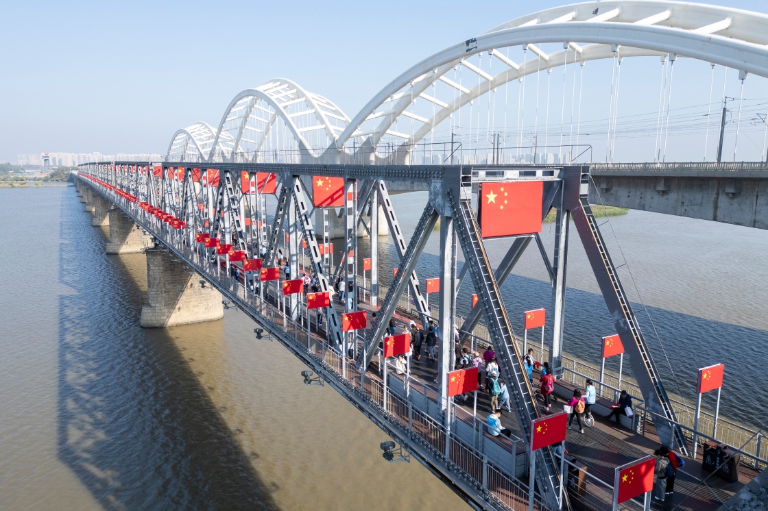 10月1日,游客在哈尔滨市滨州铁路桥上游览(无人机照片)。