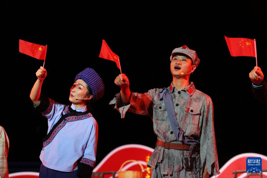 10月1日,演员在重庆市黔江区武陵水岸表演红色情景剧《守望》。新华社发(杨敏摄)