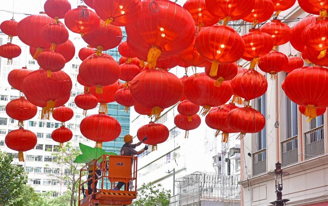9月28日,工作人员在香港利东街悬挂大红灯笼。新华社记者 陈铎 摄
