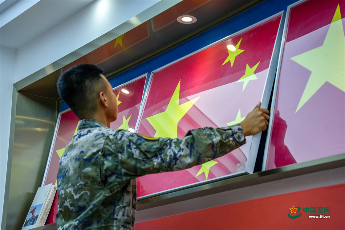 战士整理“国旗陈列室”珍藏的国旗。