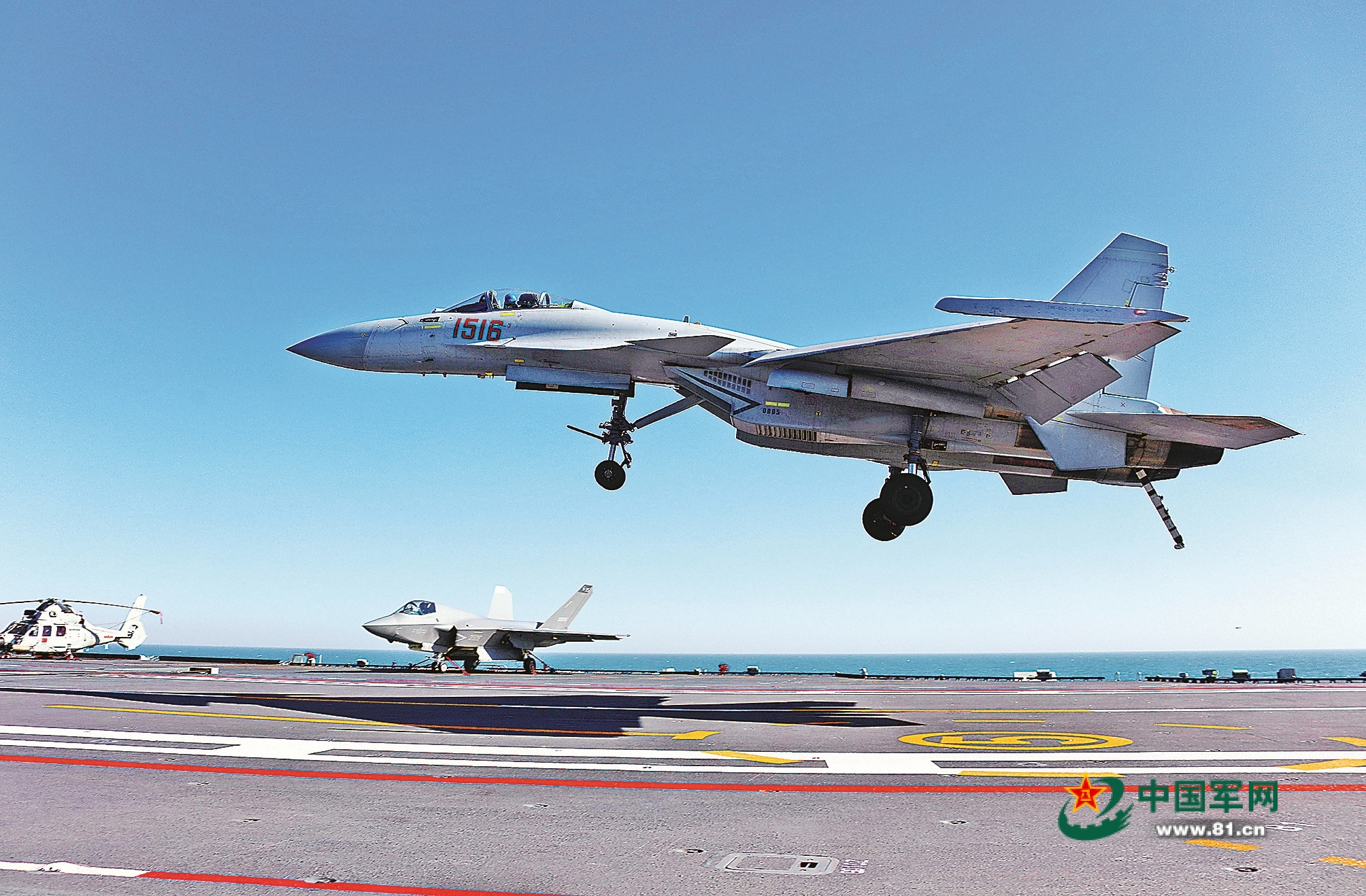 2012年11月23日,海上风平浪静,甲板上黄色引导线格外醒目,身着各色马甲的地勤人员沿边缘疾走,细致检查阻拦索与甲板状况,连一颗螺丝钉都不放过。
