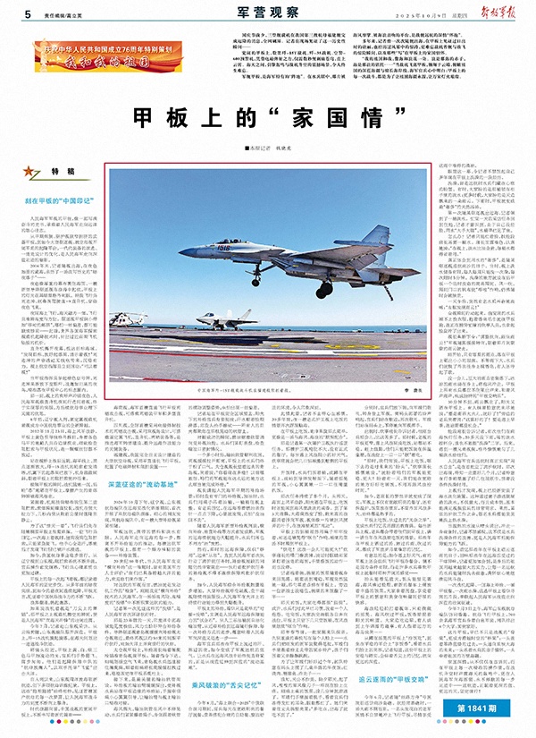 多年来,记者曾一次次随舰出海,在甲板上见证过日出时的壮丽,也经历过风暴中的惊涛,更难忘战机着舰与放飞的惊险瞬间,以及那些“写”在甲板上的家国情怀。