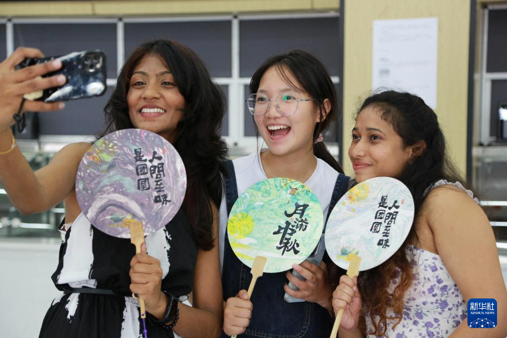 10月6日,在位于云南省蒙自市的红河学院,中外学生参加“千里共婵娟,青年话团圆”中秋节茶话会活动。新华社发(薛莹莹摄)