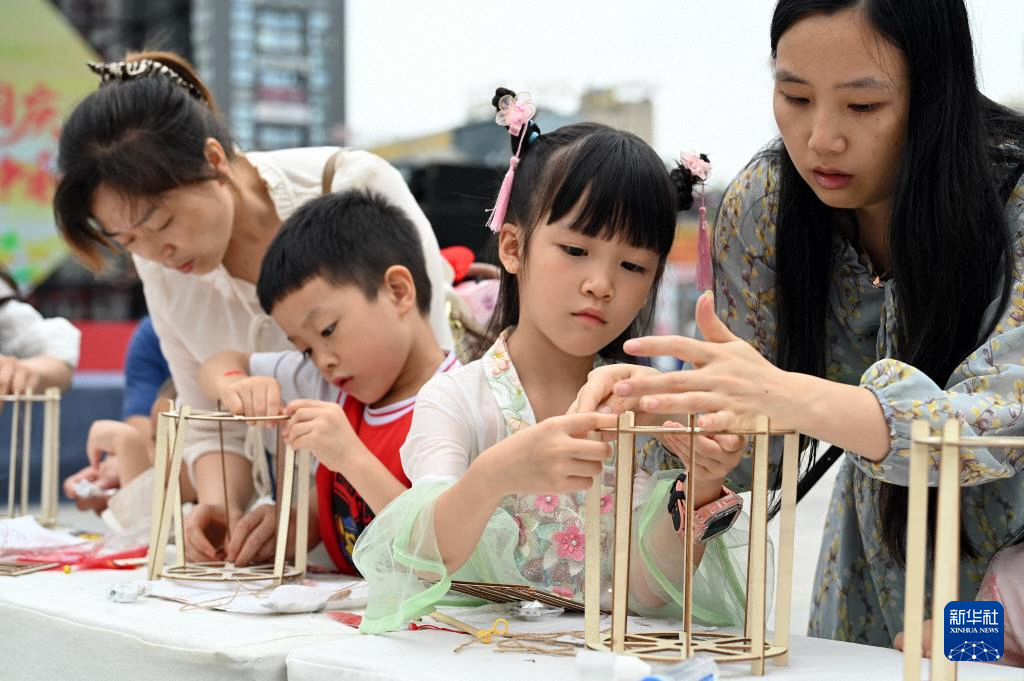 10月6日,在四川省内江市东兴区西林街道,孩子们和家人一起制作中秋灯笼。新华社发(唐明润摄)