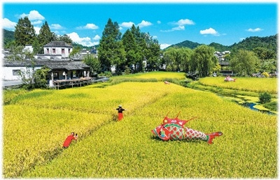 近日,安徽省黄山市黟县的西递古村落举办创意晒秋活动,打造文旅融合的新场景。图为游客在村中游玩。施亚磊摄(人民图片)