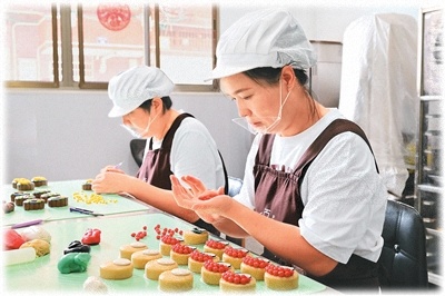 浙江省金华市婺城区百荷寻味创意美食工作坊内,工作人员正忙着赶制手工文创月饼,供应中秋节日市场。时补法摄(人民图片)