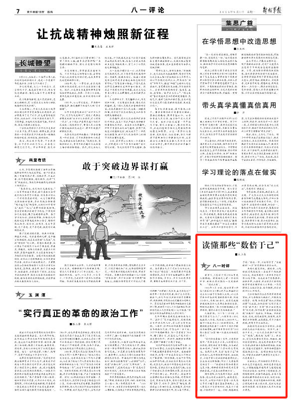 “我们必须奉献于生命,才能获得生命。”我军自成立以来,入伍誓词几经修改,但变的是文字内容,不变的是铁血精神,“牺牲”二字始终没有改动。抗战烽火中,直面“数倍于己”的凶残敌人,我军将士横刀敌阵、沥血孤营,以超乎常人的血性胆魄看待死亡,甚至主动选择牺牲,印证了克劳塞维茨的名言——“物质的原因和结果不过是刀柄,精神的原因和结果才是贵重的金属,才是真正的锋利刀刃”。