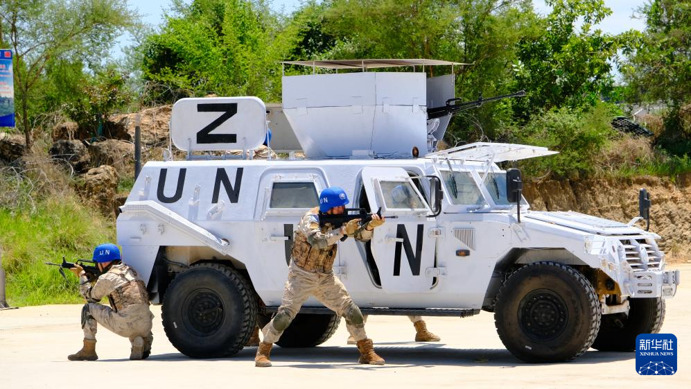 陆军某旅“刘老庄连”远赴南苏丹执行国际维和任务,官兵进行班组战斗动作课目训练(2023年5月20日摄)。新华社发(任郭洋 摄)