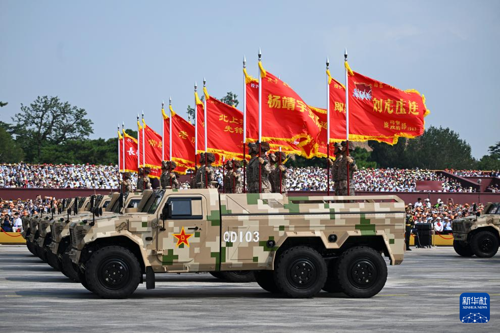 2025年9月3日,纪念中国人民抗日战争暨世界反法西斯战争胜利80周年大会在北京隆重举行。这是战旗方队通过天安门广场。新华社记者 刘勇贞 摄
