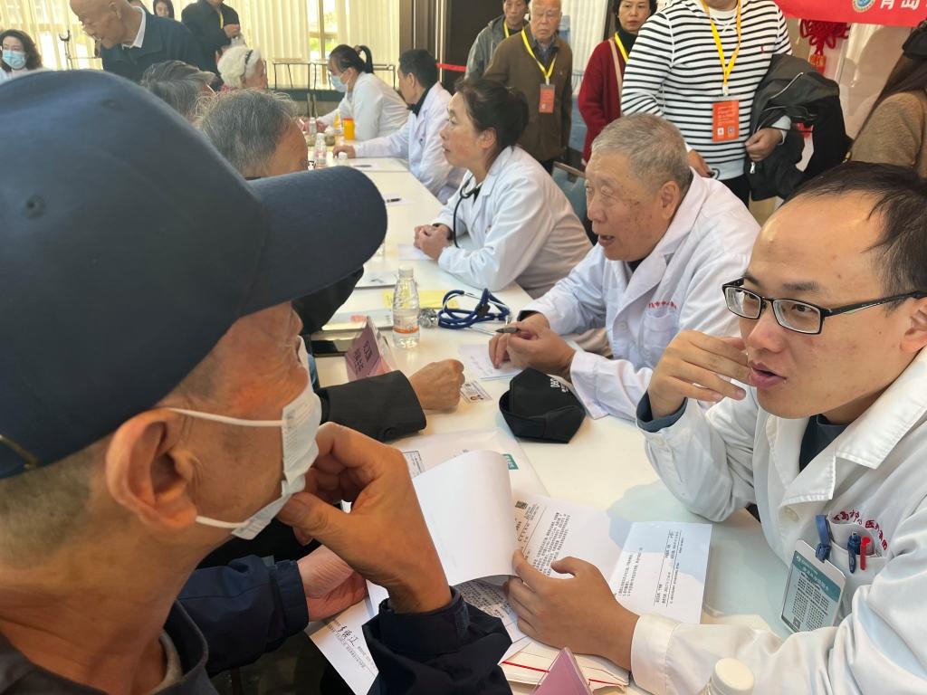 在活动现场,一幕幕温馨的场景不断上演:老人们有序地在各个科室专家答疑桌前静静地排队等候;医生们或蹲或坐,耐心地倾听每位老人的诉求,细致解答他们的疑问……