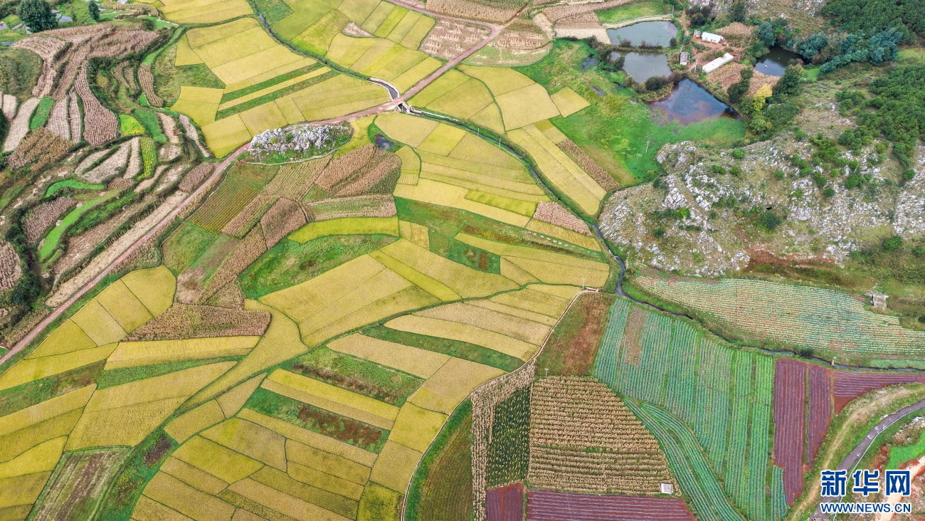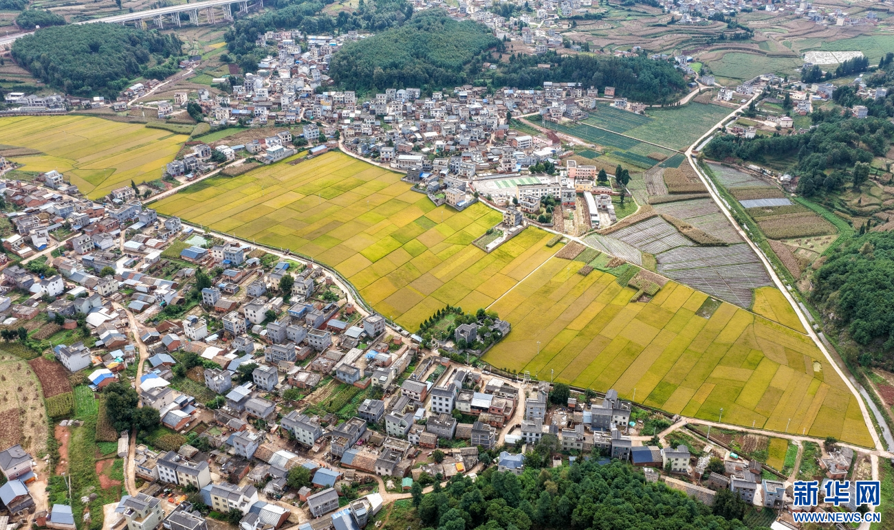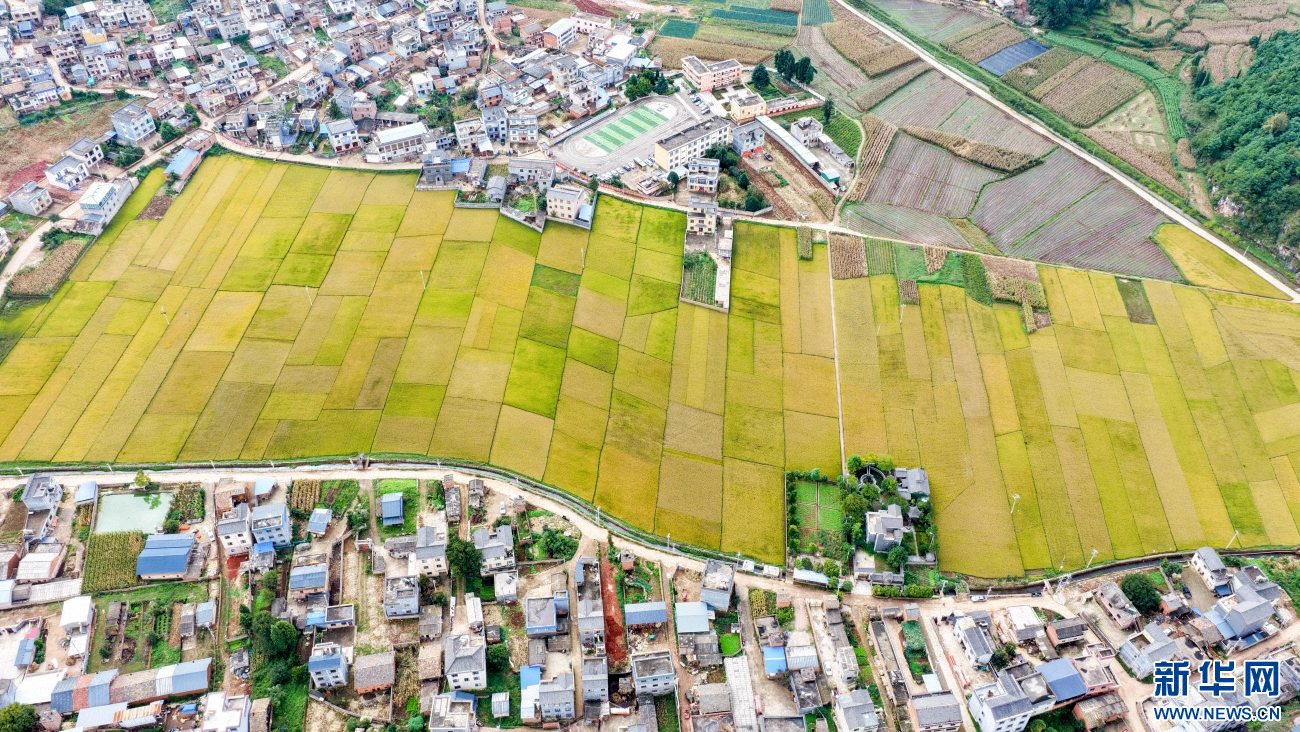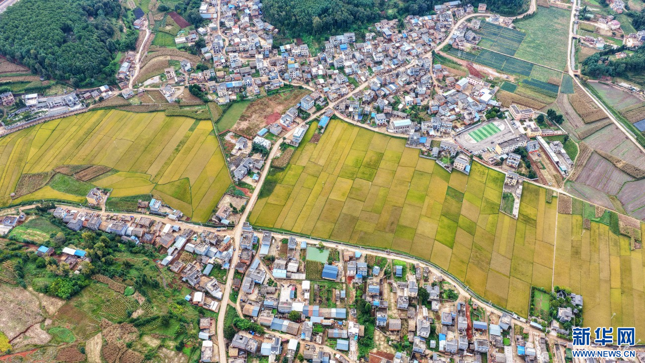 金秋时节,云南省曲靖市沾益区播乐乡乐利村“丰”景如画。在秋日大地的“调色盘”上,金黄色稻田呈条块状排列,与错落有致的民居、绿树、山地、道路共同勾勒出一幅优美的田园丰收画卷。(孙文来)