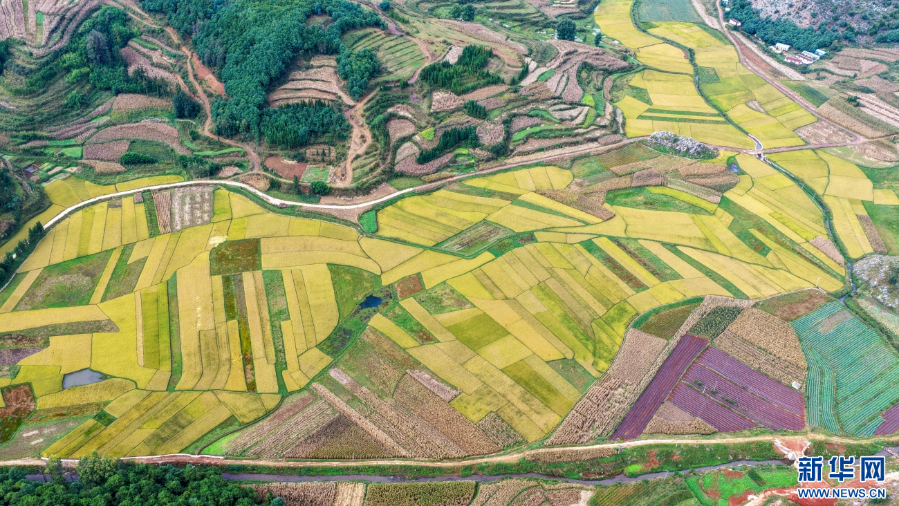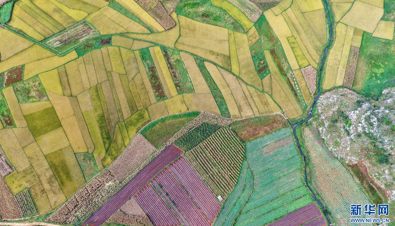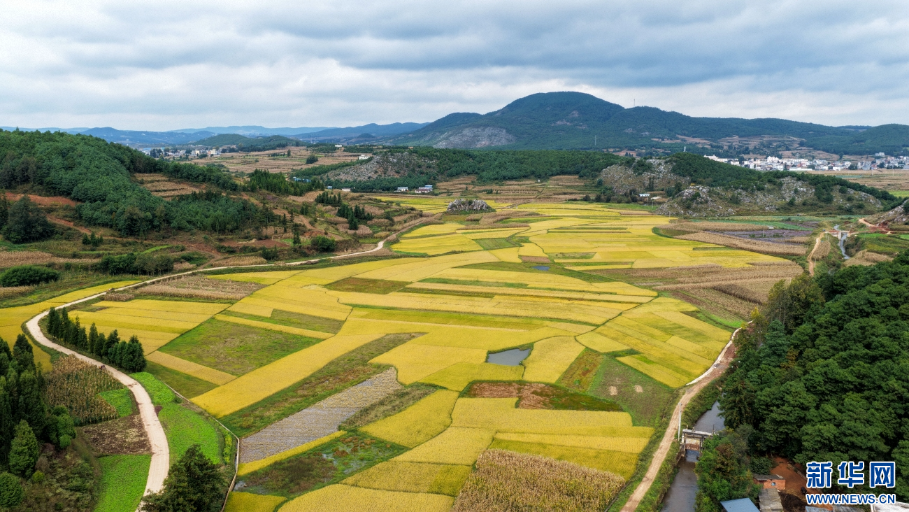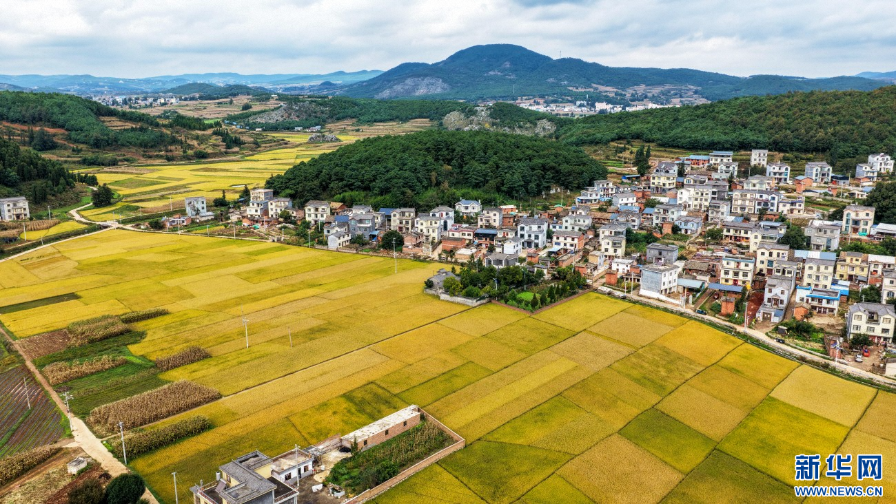 金秋时节,云南省曲靖市沾益区播乐乡乐利村“丰”景如画。在秋日大地的“调色盘”上,金黄色稻田呈条块状排列,与错落有致的民居、绿树、山地、道路共同勾勒出一幅优美的田园丰收画卷。(孙文来)