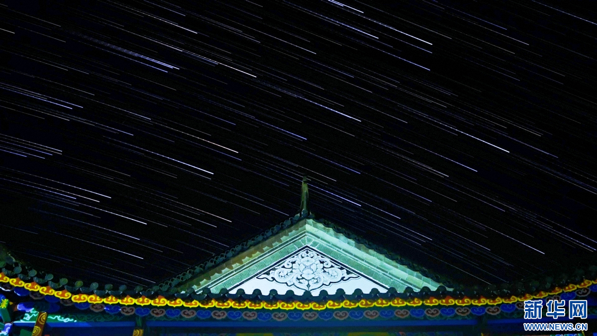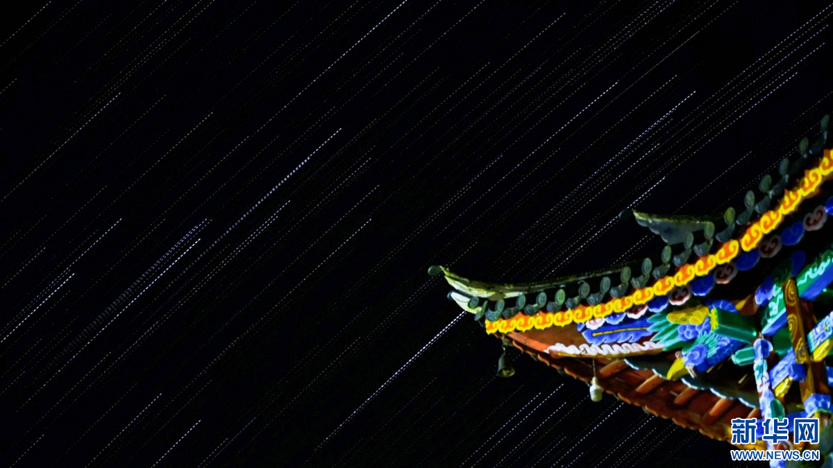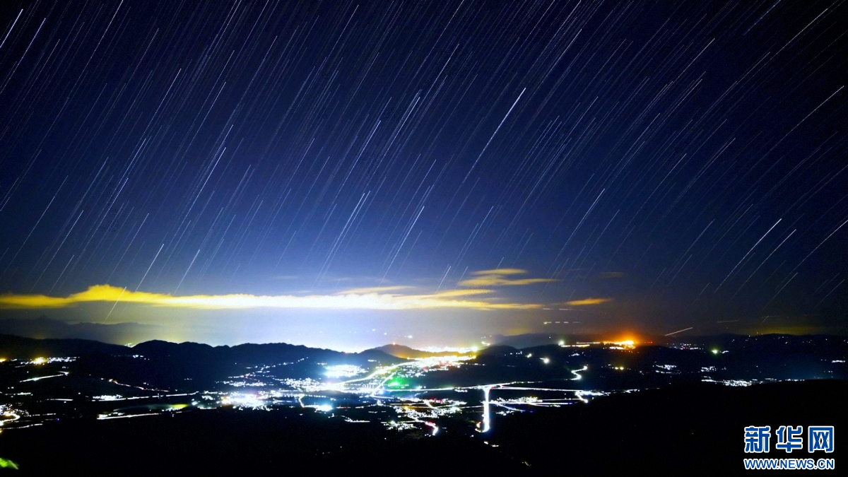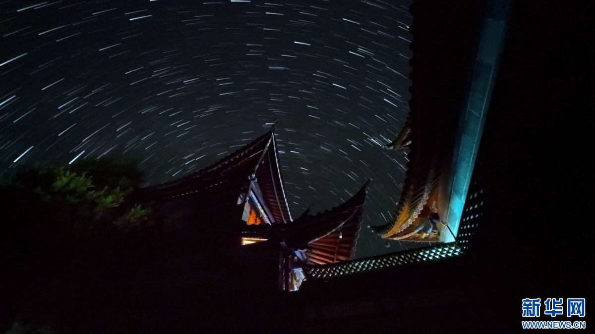 近日,摄影师在云南省腾冲市新岐冒盔山用延时摄影拍摄到夜空群星璀璨,星轨在山头旋转,梦幻而浪漫。(赵辉 李谚 钱林川)