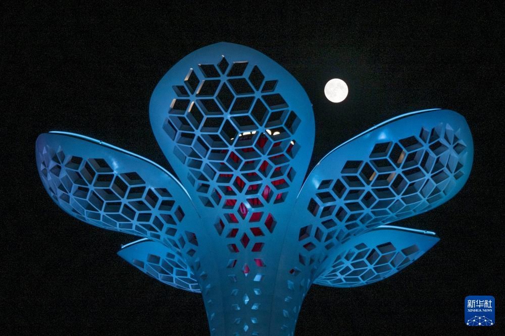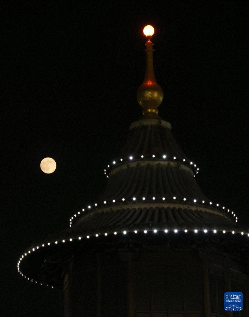 10月6日,一轮圆月与江苏省扬州市文昌阁的灯光相映成趣。新华社发(孟德龙 摄)