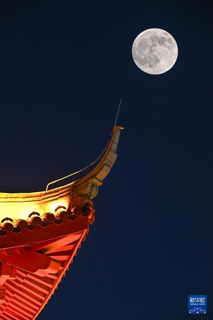 10月6日,一轮圆月与江苏省扬州市文昌阁相映成趣。新华社发(孟德龙 摄)